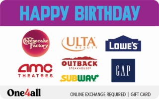 Make their birthday wishes come true! Let them choose the perfect gift from a great selection of restaurants, retailers, and entertainment. Exchange this HAPPY BIRTHDAY One4all Favorites Gift Card at redeem.giftcards.com for a choice of eGift(s) to spend at one or more of these brands: AMC Theatres, Gap, Lowe’s, Outback Steakhouse, Subway, The Cheesecake Factory, Ulta Beauty.