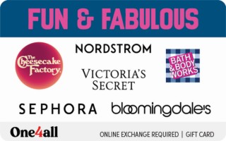 Shop. Dine. Indulge. Celebrate the fabulous people in your life with a gift they can use however they want. Great for teachers, grads, moms and more! Exchange this FUN & FABULOUS One4all Favorites Gift Card at redeem.giftcards.com for a choice of eGift(s) to spend at one or more of these brands: Bath & Body Works, Bloomingdales, Nordstrom, Sephora, The Cheesecake Factory, Victoria's Secret.
