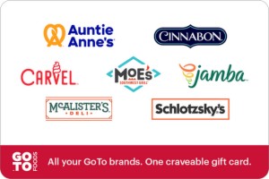 The one gift card to fulfill any craving, valid at seven fan-favorite brands with over 3,900 locations across the U.S. This GoTo Foods gift card is redeemable at participating Auntie Anne’s, Carvel, Cinnabon, Jamba, McAlister’s Deli, Moe’s Southwest Grill and Schlotzsky’s locations.